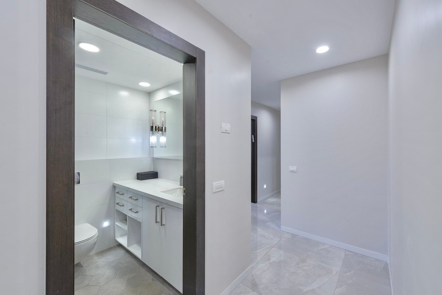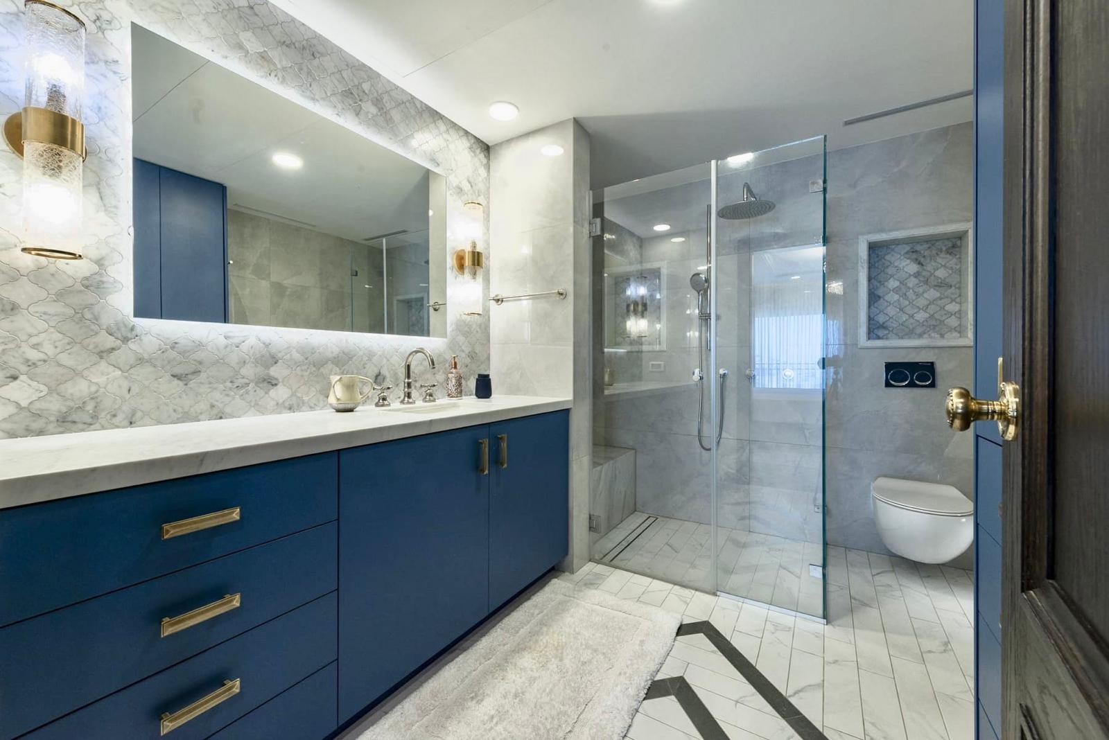 The second bathroom is a full guest bathroom with a walk-in shower, sink, and toilet.