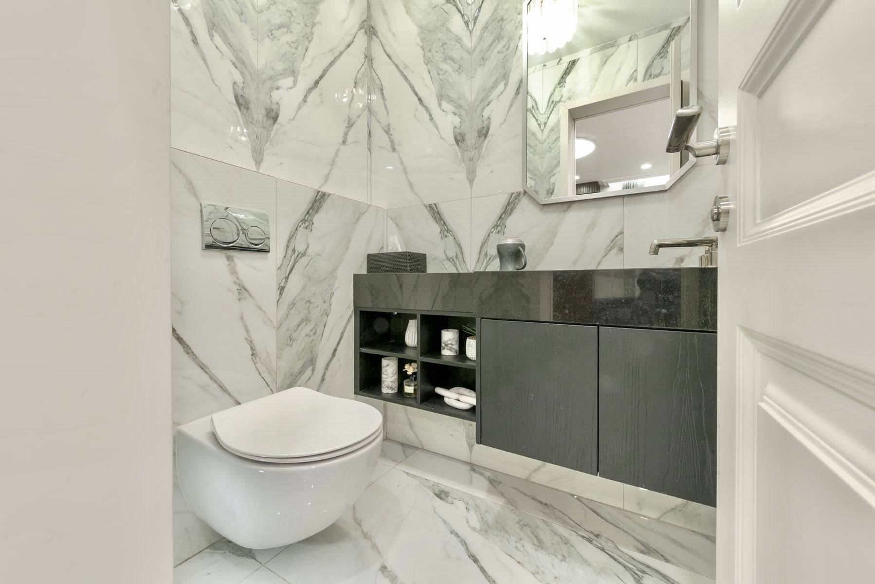 The first bathroom is a powder room with a sink and toilet.