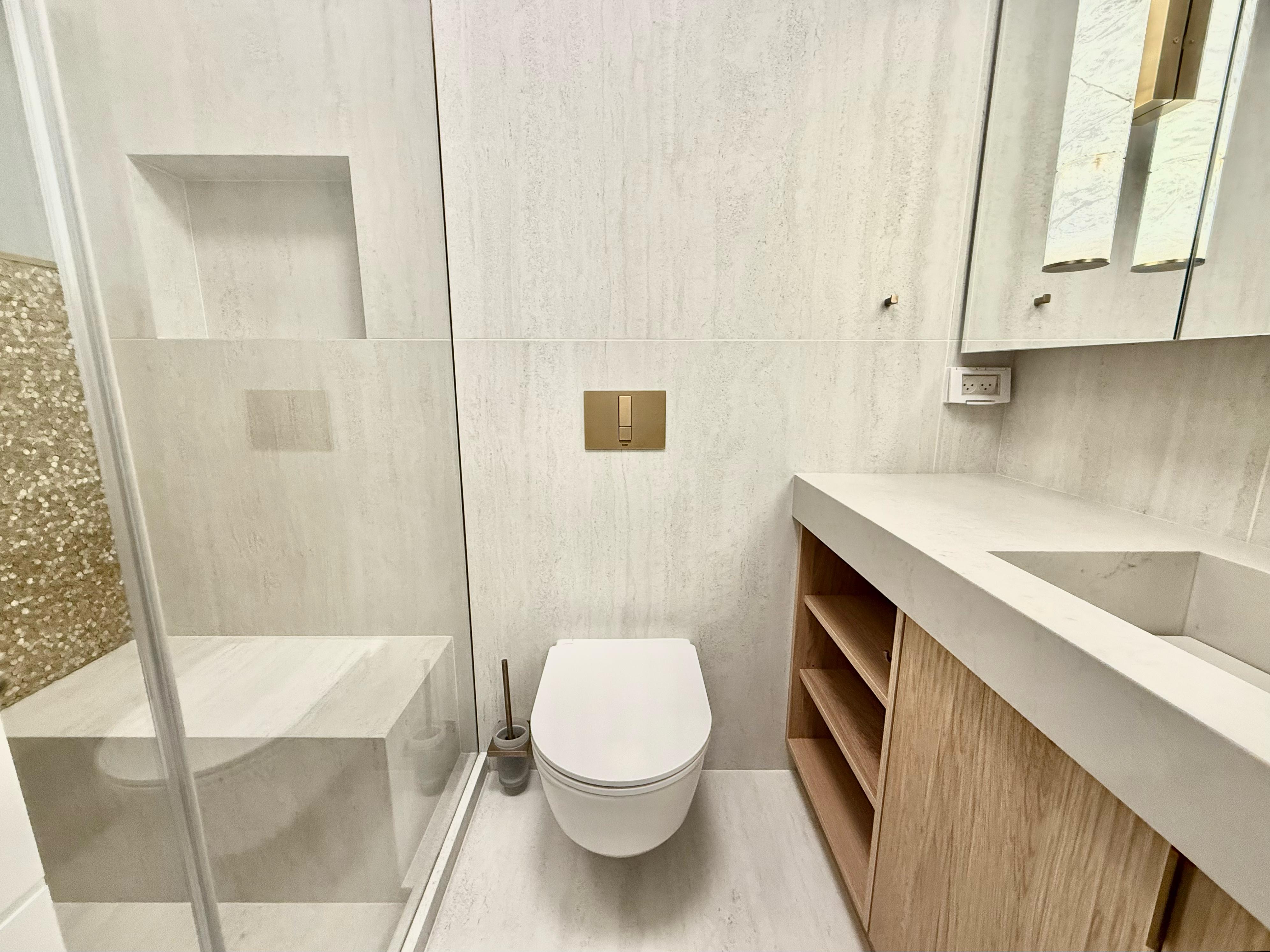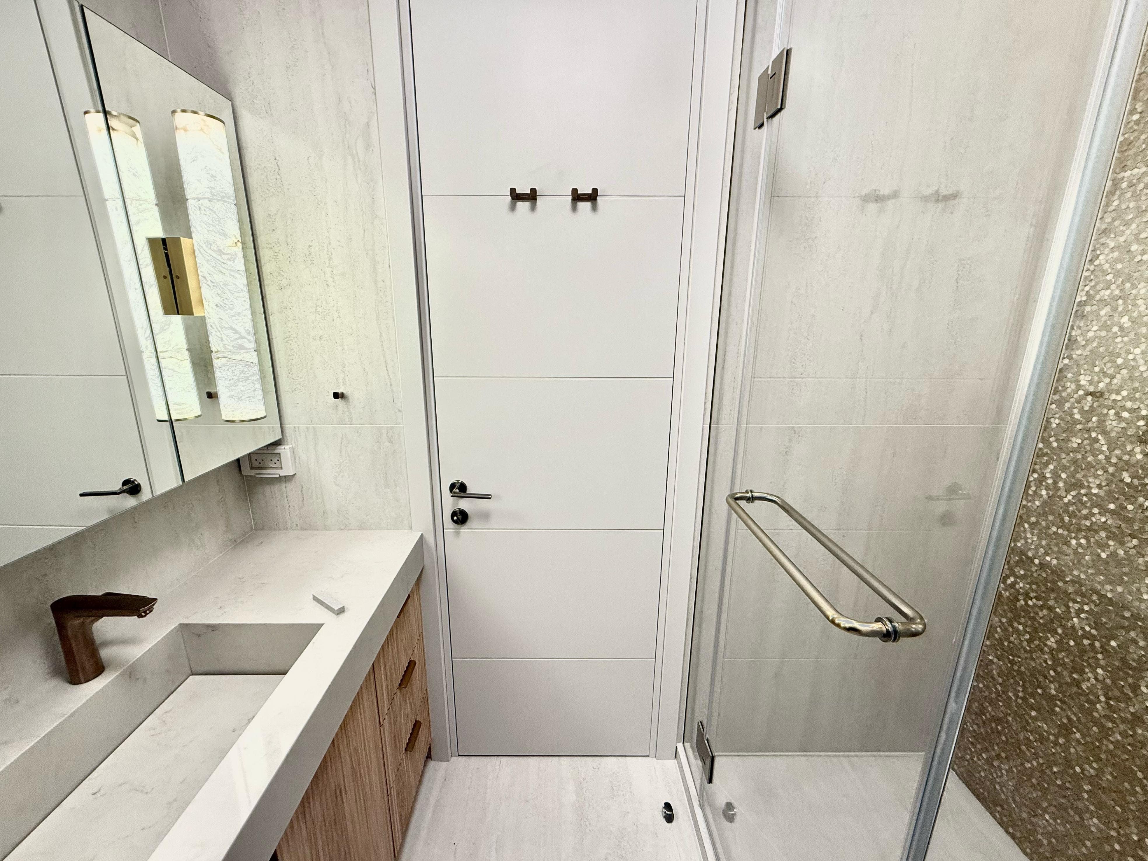 The first bathroom is the master ensuite bathroom with a walk-in shower, sink, and toilet.