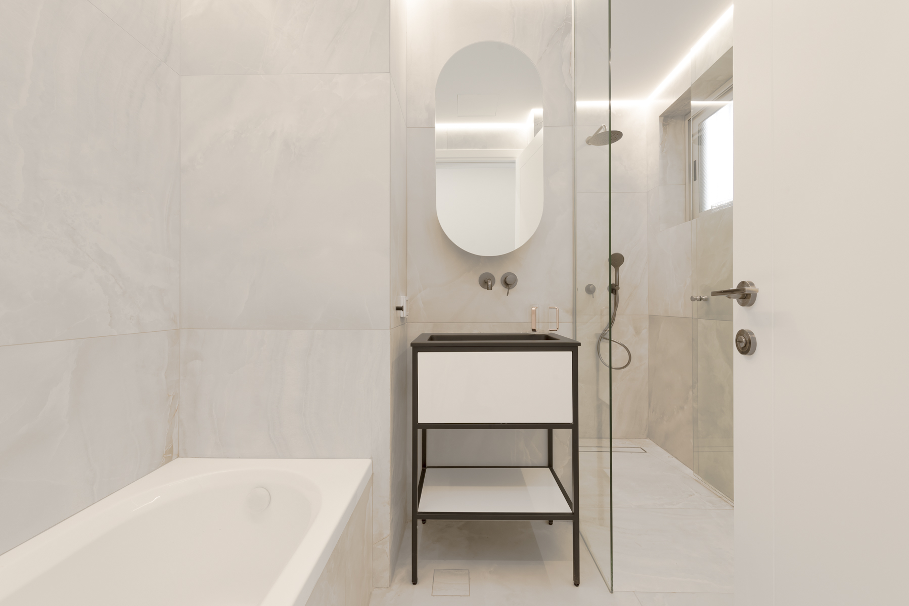 The third bathroom is a full guest bathroom with a bathtub, walk-in shower, sink, and toilet.