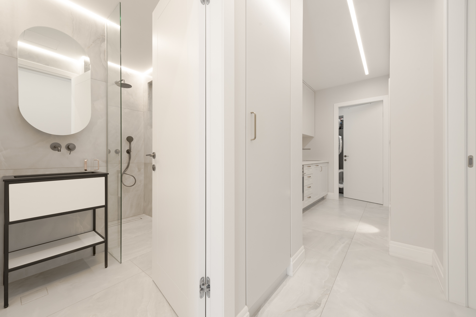 The first bathroom is a powder room located in the main living area with a sink and toilet.